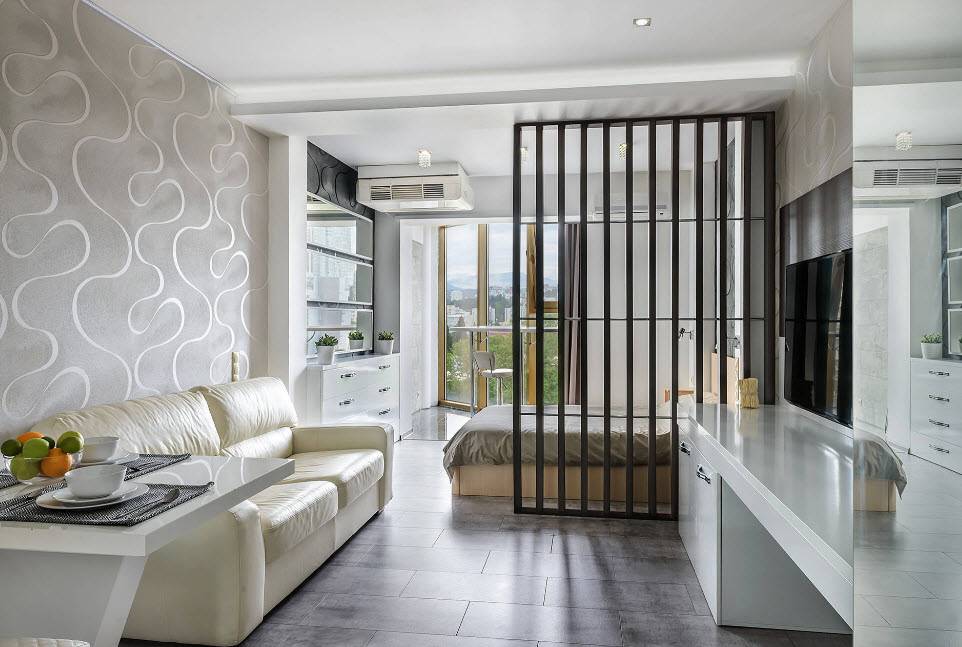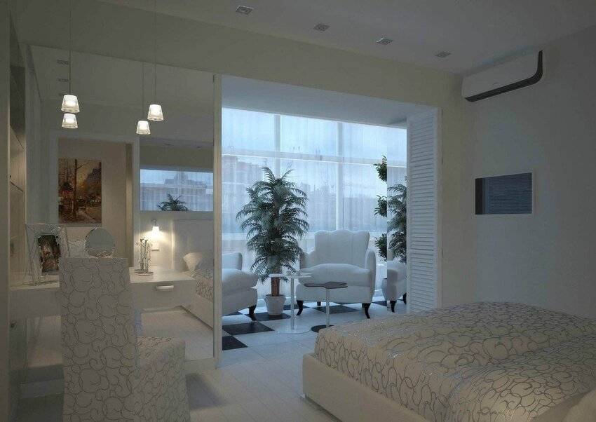 Если размер лоджии дает такую возможность, туда и вовсе можно перенести спальную зону. В результате, размер гостиной останется таким же, но без необходимости заботиться о создании перегородок, отделяющих спальное место от жилой зоны.