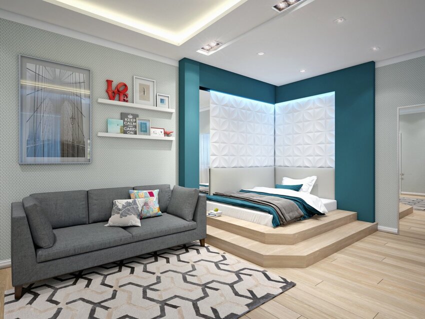 Если в перегородке нет необходимости, зоны все равно, как правило, выделяют. Для этого используются такие приемы, как комбинирование отделки, создание балдахина, закрывающего кровать со всех сторон, или оборудование подиума.