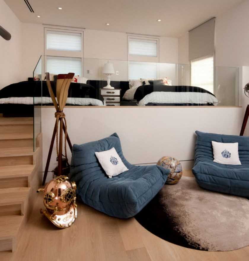 Это очень неожиданный ход, который точно не оставит равнодушными ни домочадцев, ни гостей. Особенно такой вариант может понравиться детям. Смысл вертикального зонирования в расположении мягкой лежанки прямо под потолком. В таком импровизированном «гнёздышке» можно не только спать ночью, но и отдохнуть днём с книгой, посидеть в интернете с планшета или слушать музыку в наушниках, не мешая домочадцам. Для подобных конструкций в комнате должны быть достаточно высокие потолки.