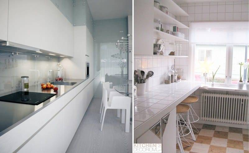 Дизайн узкой кухни гармоничнее всего выполнять в минималистичном или скандинавском стиле. Сдержанность этих стилей подойдет как нельзя кстати, ведь на узкой кухне не допустимы какие-либо лишние предметы или массивные конструкции. Эти стили любят порядок, простоту, минимум мелочей, загромождающих пространство, — как раз то, что нужно на длинной кухне. Светлые тона лучше выбирать не только для отделки, но и при выборе мебели.