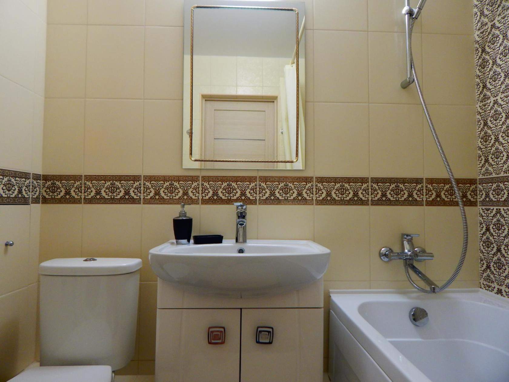 Маленькая ванная с пиксельной плиткой в функциональной зонеИсточник yandex.by