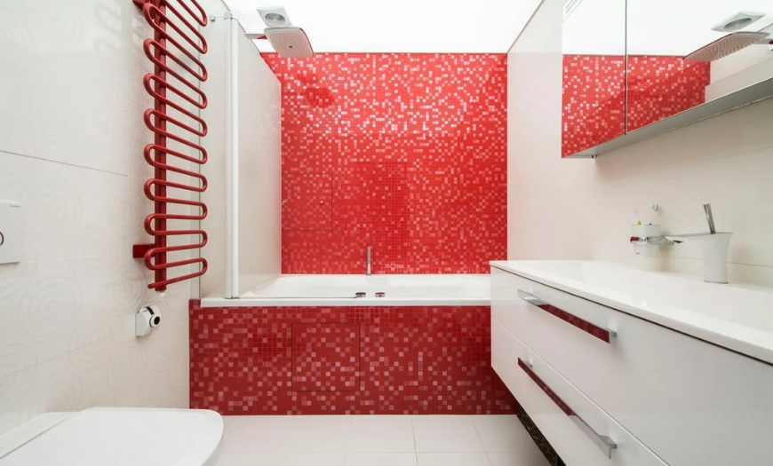 Огненный цвет, очень яркий, вызывающий сильное возбуждение. Рекомендован для больших ванных комнат. В интерьере ванной сочетается с белым, синим, серым цветами и имитацией древесины.