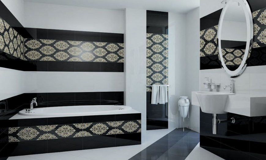 - в больших ванных комнатах очень дорого и благородно смотрится черная облицовка, особенно в сочетании с позолотой;