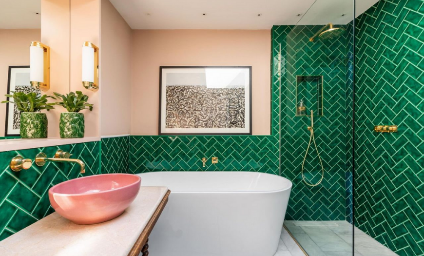 Красивый цвет, но не отделывайте ванную комнату только им. Сочетайте с белым, бежевым, синим, фиолетовым, оранжевым, серым.