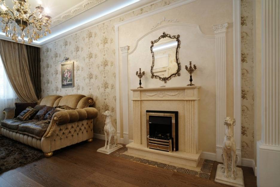 От современного стиля классика отличается более тщательной проработкой деталей, насыщенностью характерными элементами лепнины — карнизами, молдингами, арками, часто используется фальш-камин, зеркала, золочение или серебрение лепнины.