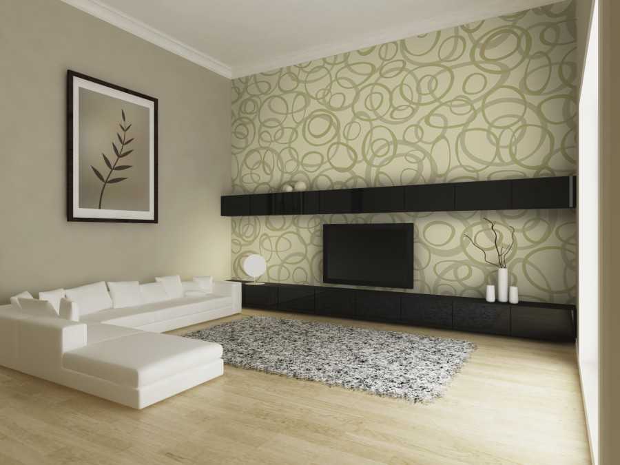 При выборе нужно учитывать размер зала. В малогабаритных помещениях лучше не использовать крупные и слишком яркие узоры и принты. Для современных гостиных часто выбирают виниловые обои с геометрическим орнаментом, которые создают ощущение непрерывного пространства.