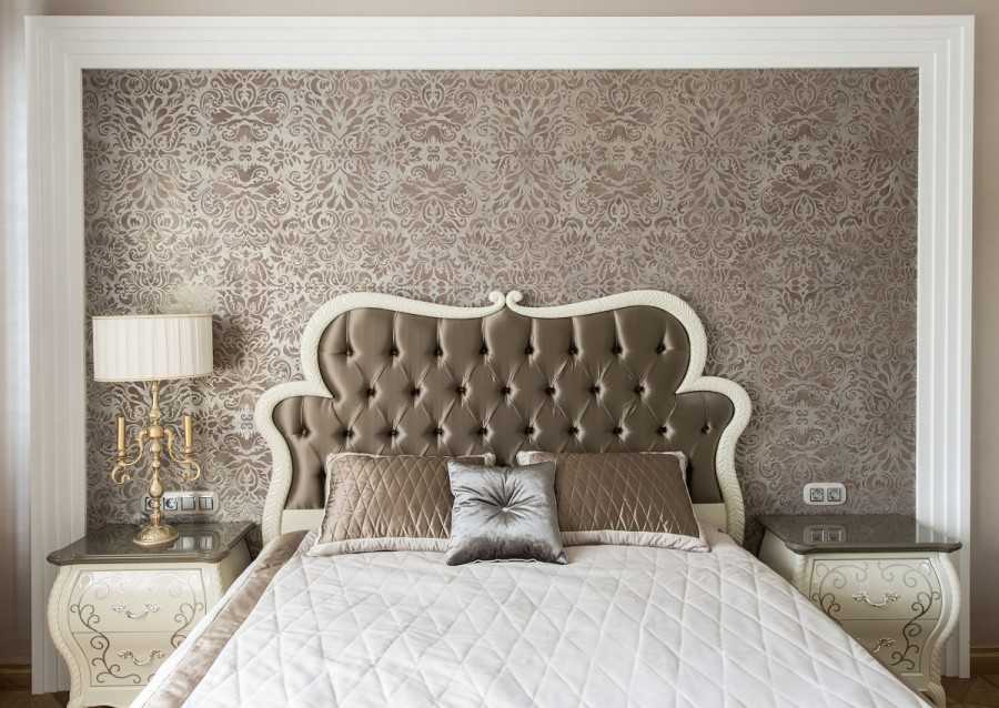 Необычную картину образуют элементы, обрамленные в рамы и молдинги. На фоне спокойного оттенка обоев могут быть вставки с витиеватыми узорами. Подобное комбинирование подходит для интерьера в классическом стиле.