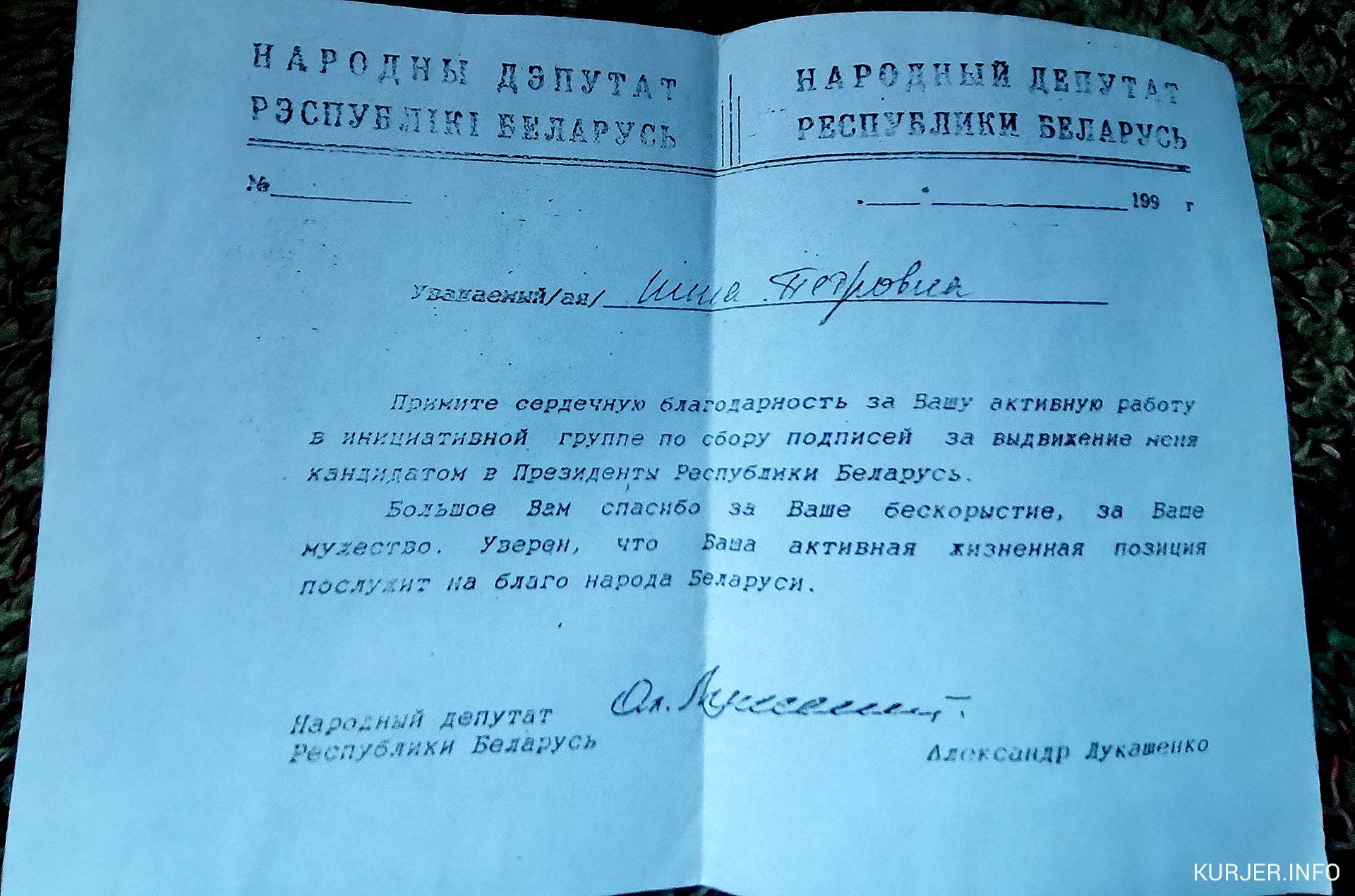 «Я помогала Александру Григорьевичу стать президентом. Ещё тогда, в первый раз. У меня даже его личная благодарность есть», — говорит она и достаёт лист. На нём написано: «Уважаемая Нина Петровна! Примите сердечную благодарность за вашу активную работу в инициативной группе по сбору подписей за выдвижение меня кандидатом в Президенты Республики Беларусь. Большое вам спасибо за ваше бескорыстие, за ваше мужество…». Внизу стоит факсимильная подпись — Ал. Лукашенко.