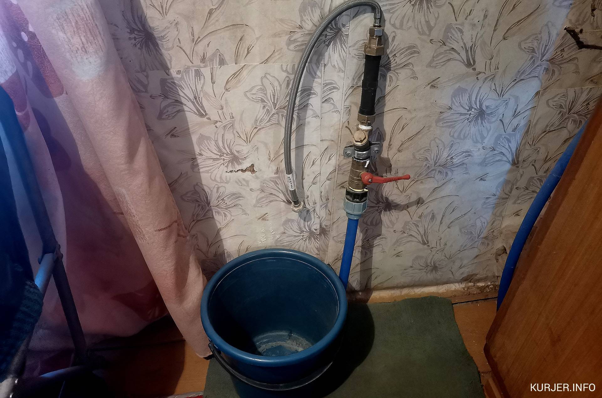 В спальне из-под пола торчит кусок трубы со шлангом и краном. Это водопровод. На вопрос, почему водопровод подведён не на кухню, хозяйка поясняет: «На кухне они не стали ковырять, побоялись, что стена завалится».