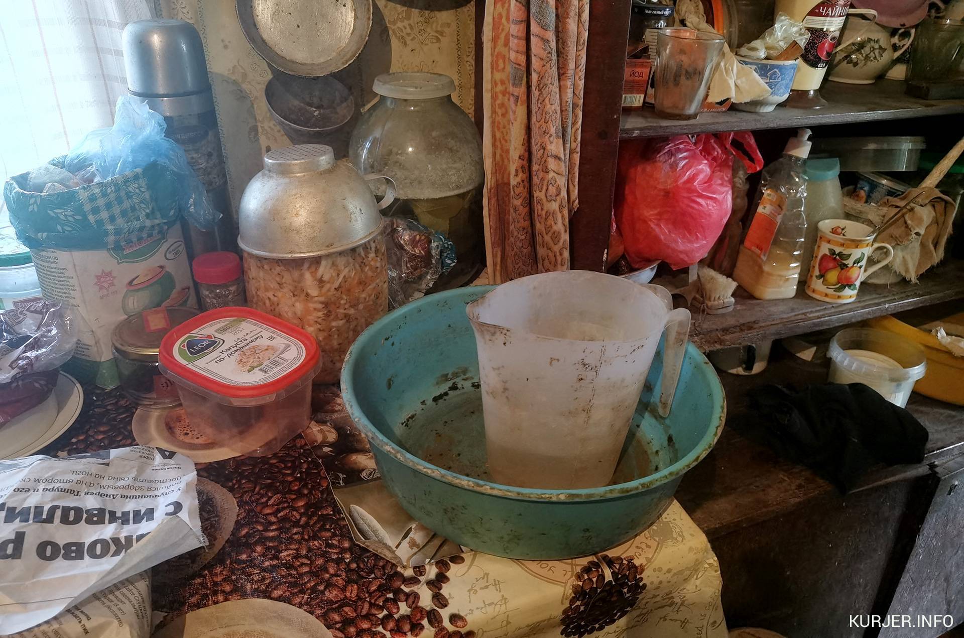 Водопроводная труба выходит из-под пола в спальнеУмывается она на кухне над маленьким тазиком, поливая себе из кувшина. Тут же моется и сама, но уже над большим тазом. В качестве туалета — пластмассовое ведро. Пищу варит на одноконфорочной электроплитке или на печке.