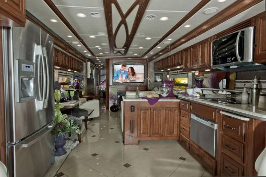 В прицепе есть кухня (белый кухонный гарнитур с подсветкой, две раковины, духовка, плита и большой холодильник).