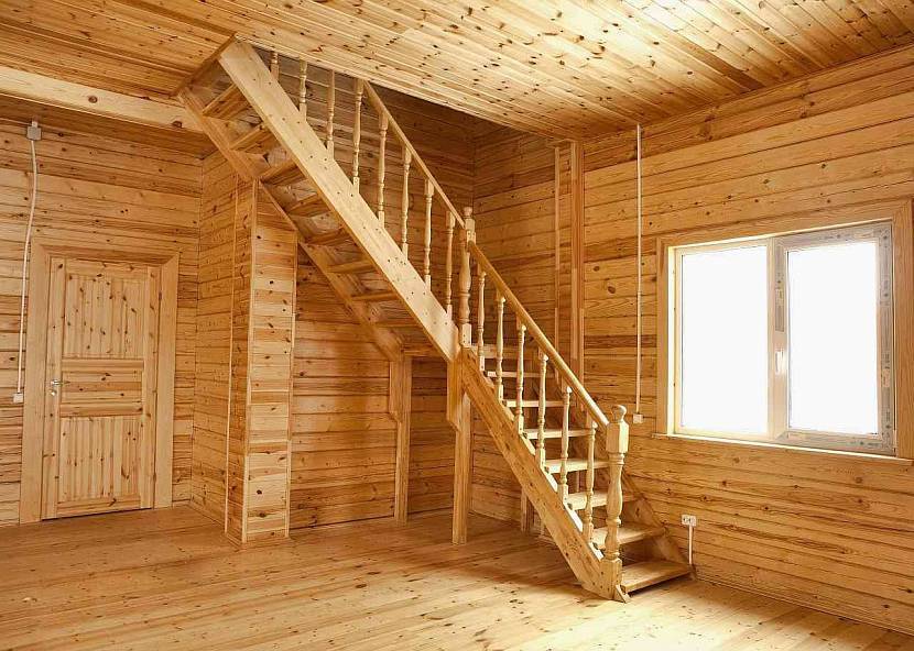 Если в доме из бревна нужна лестница на второй этаж – то, конечно же, она должна быть из дерева. И при ее изготовлении открывается широчайший спектр возможностей. В одном интерьере она может быть правильной, и даже строгой. Идеально ровные ступени ограждаются такими же прямыми и тщательно обработанными перилами.