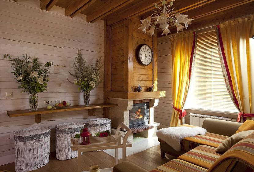 В таких интерьерах уместно смотрится нарочито грубая конопатка щелей, кривоватые балки и подпорные столбы. Нередко применяется мебель, лестницы и другие элементы из искусственно состаренного дерева. Они могут иметь явно выраженную фактуру (руст), трещины или следы ударов. Все поверхности – матовые, но тщательно заглаженные. В подобных интерьерах отлично смотрятся предметы в стилях винтаж, шебби-шик, кантри.