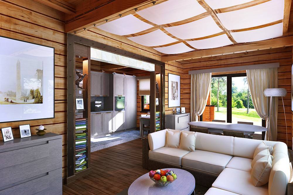 Модерн, как стиль интерьера дома из оцилиндрованного бревна фото показывает полноту этого направления