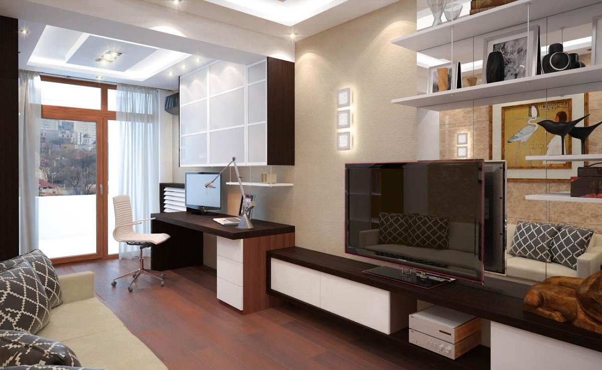 Это очень логичный вариант – в гостиной принимают друзей, отдыхают и не обойтись без чаепития или праздничных вечеринок. Достаточно визуально отделить кухонную зону барной стойкой, а с другой стороны поставить диван, телевизор, стенку, и вы получите удобный многофункциональный рабочий кабинет.