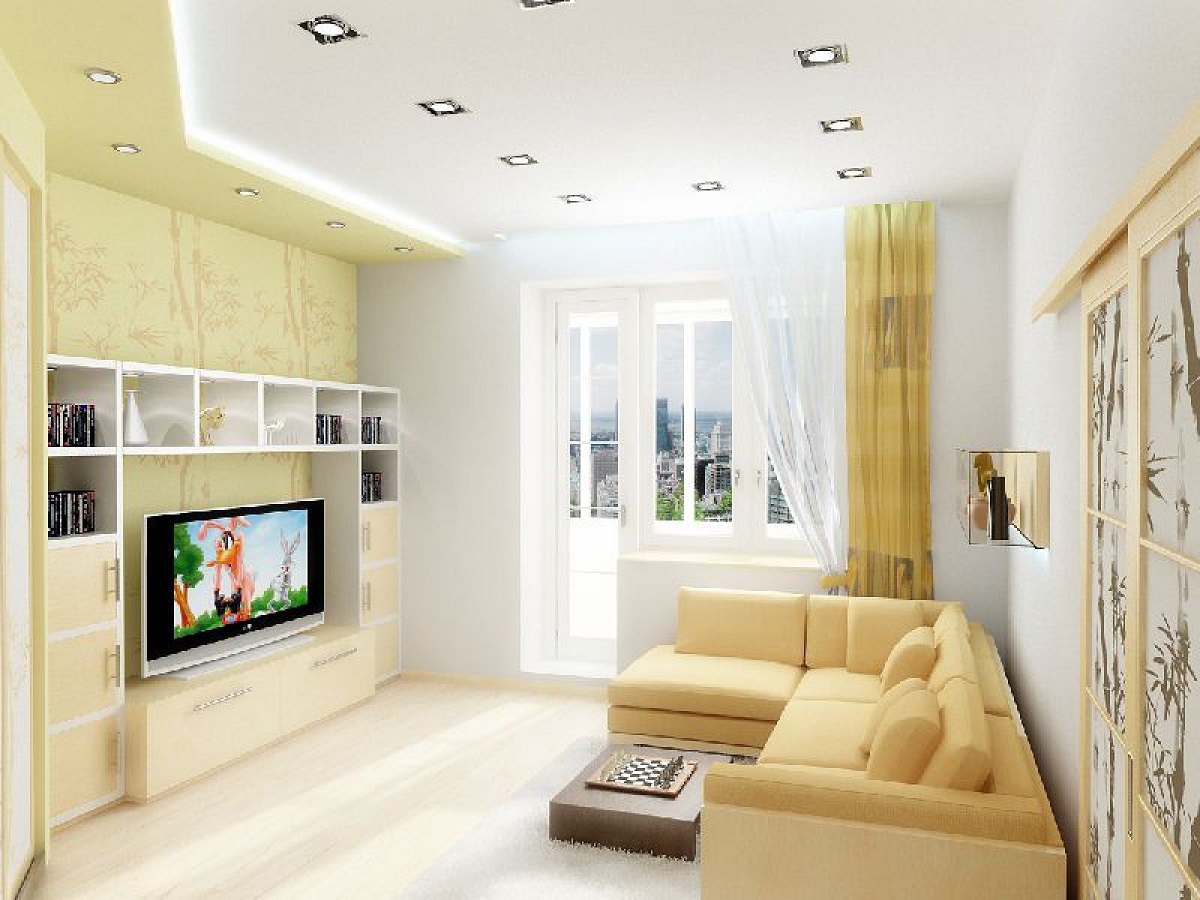 Отличным вариантом для маленького зала будут модели трансформеры и монтируемая техника. Чтобы комната была уютной, в качестве декора можно применять маленькие полочки с подсвечиванием.