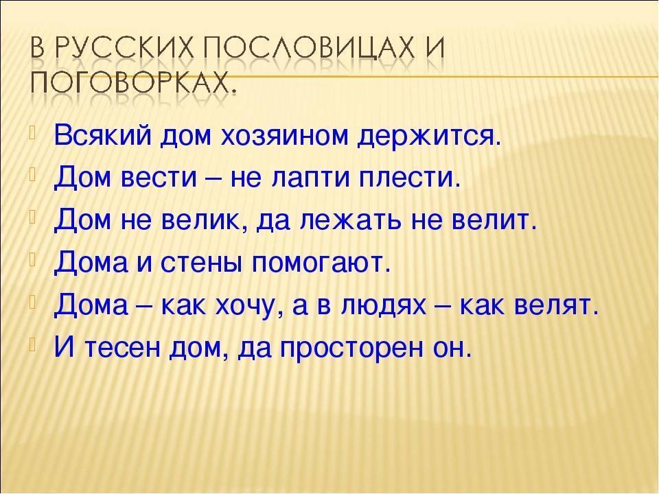 - Хорошо тому, кто в своем дому. Пословица подчеркивает ценность дома для каждого человека. Иметь свой дом и свою семью – это истинное богатство, поэтому и говорят, что хорошо тому, кто в своем дому находится.
