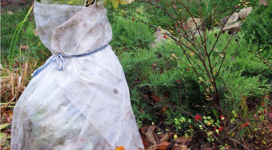 5. После наступления устойчивых заморозков в начале-середине ноября растения укрывают, сооружая “шалашик” из лапника, можно использовать мешковину или нетканый материал (лутрасил плотностью 40 г/м2).