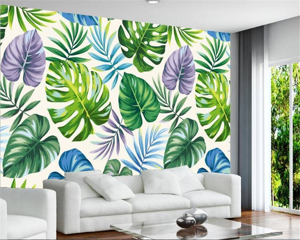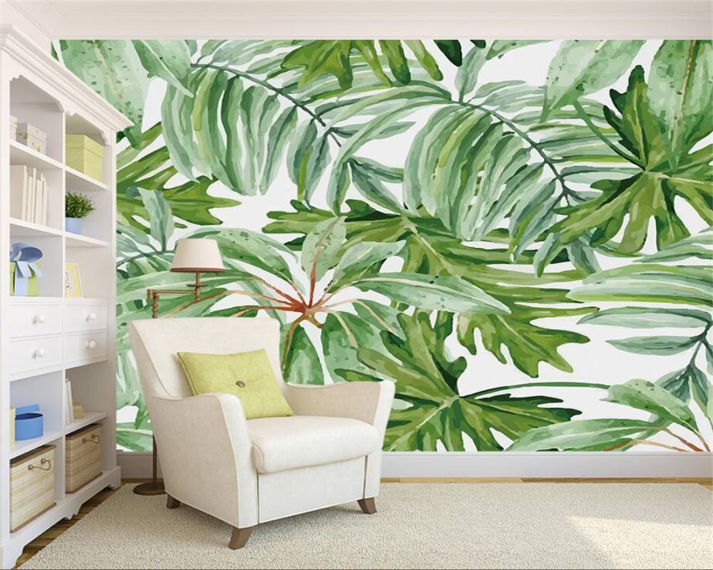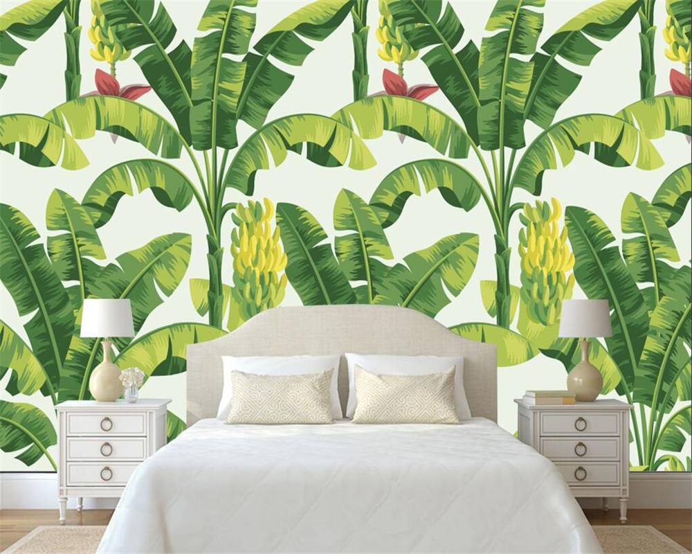 Для облицовки стен чаще всего выбирают самые простые материалы — зачастую, это привычные обои белого, сливочного, песочного или бледно-желтого оттенка. При этом поверхность их должна быть гладкой. В идеальном варианте обои будут однотонными. Не стоит использовать узор в виде полосок, геометрический орнамент или очень мелкий цветочный принт. Если такое покрытие кажется вам скучным, допустимо использовать обои с характерными узорами — пальмовыми листьями крупного размера, банановыми листьями, крупными цветами, экзотическими птицами, бамбуковыми стеблями