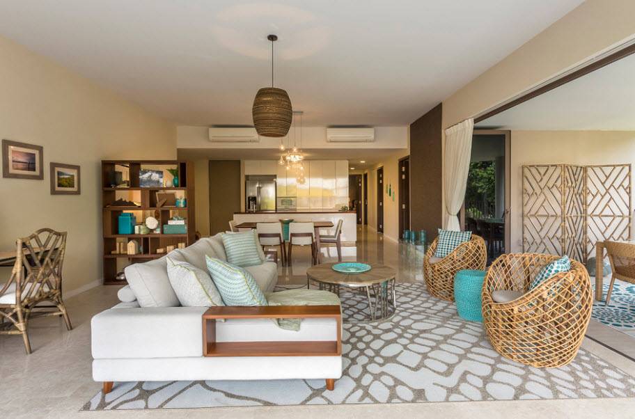 Для тропического стиля характерны фактуры природы, например, плетеная мебель из сизаля или бамбука. Хорошо, если в комнате будет много плетеных изделий, например, диван и два или три кресла, и все они должны иметь разные оттенки дерева, что-то – более светлого тона, что-то – более темного. Это придаст определенное настроение комнате.