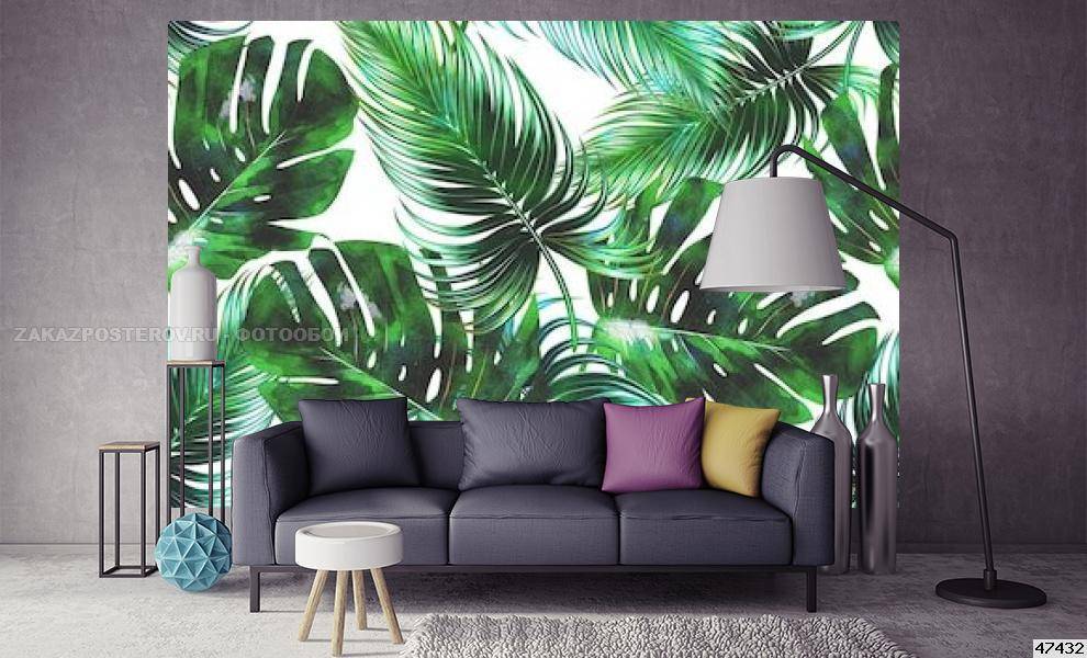 Пышная зелень растений располагает к приятной беседе. На стенах повесьте картины с экзотическими листьями в рамках, на тумбе установите настольную лампу необычной формы. Все эти вещи добавят в вашу обстановку нотки спокойствия, расслабленности и умиротворения.