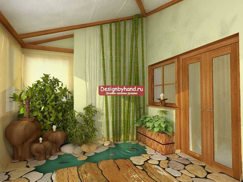 Островок экзотического тропического леса можно воссоздать с применением натуральной древесины. Любые комнатные растения найдут своё место в таком дизайне. Герань, фиалки, папоротники можно замаскировать тематическим материалом. Стоит включить всю свою фантазию.
