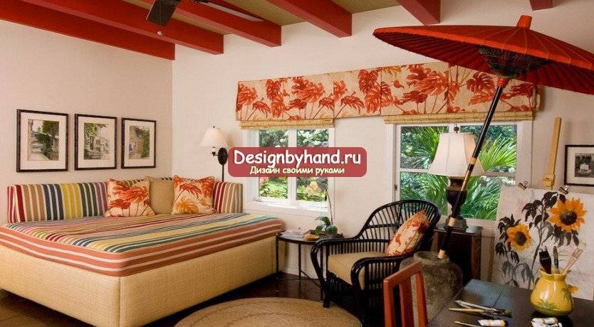 Тропический интерьер декорируется текстилем, придающим уют. Ткани натуральные и дышащие, минимально обработанные, достаточно плотные. Никакой синтетики, переливы и блеск тоже не нужны. А вот интересные принты освежат дизайн: цветы, экзотические фрукты, пальмы, разноцветные птицы, обитатели джунглей. В качестве текстильного наполнения интерьера применяются подушки и покрывала.