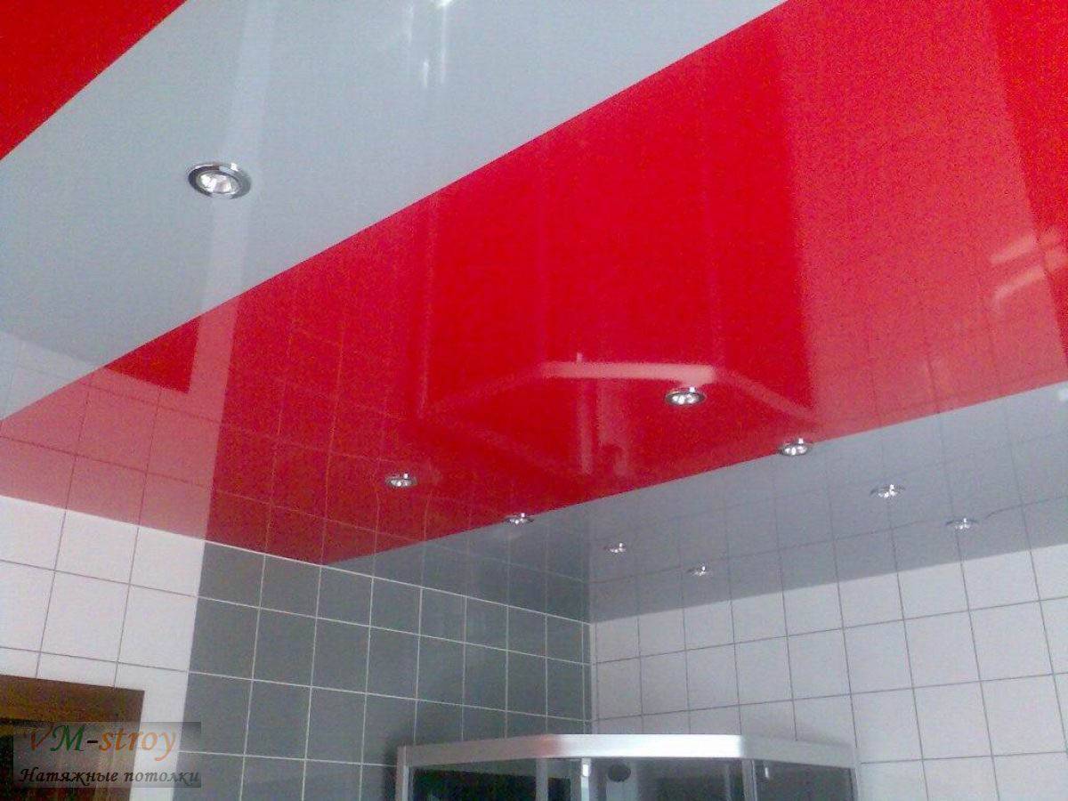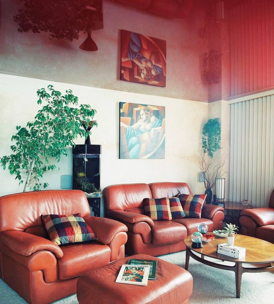 Потолок красного цвета. Потолок, растянутый в интенсивном красном цвете, является отличной идеей для решительных людей, которые любят экспериментировать в дизайне комнат. Он, несомненно, выглядит оригинально. Просто помните, что если такой сильный цвет будет на потолке, стены, мебель и техника в зале должны быть в приглушенных светлых расцветках, например, в оттенках белого или серого.