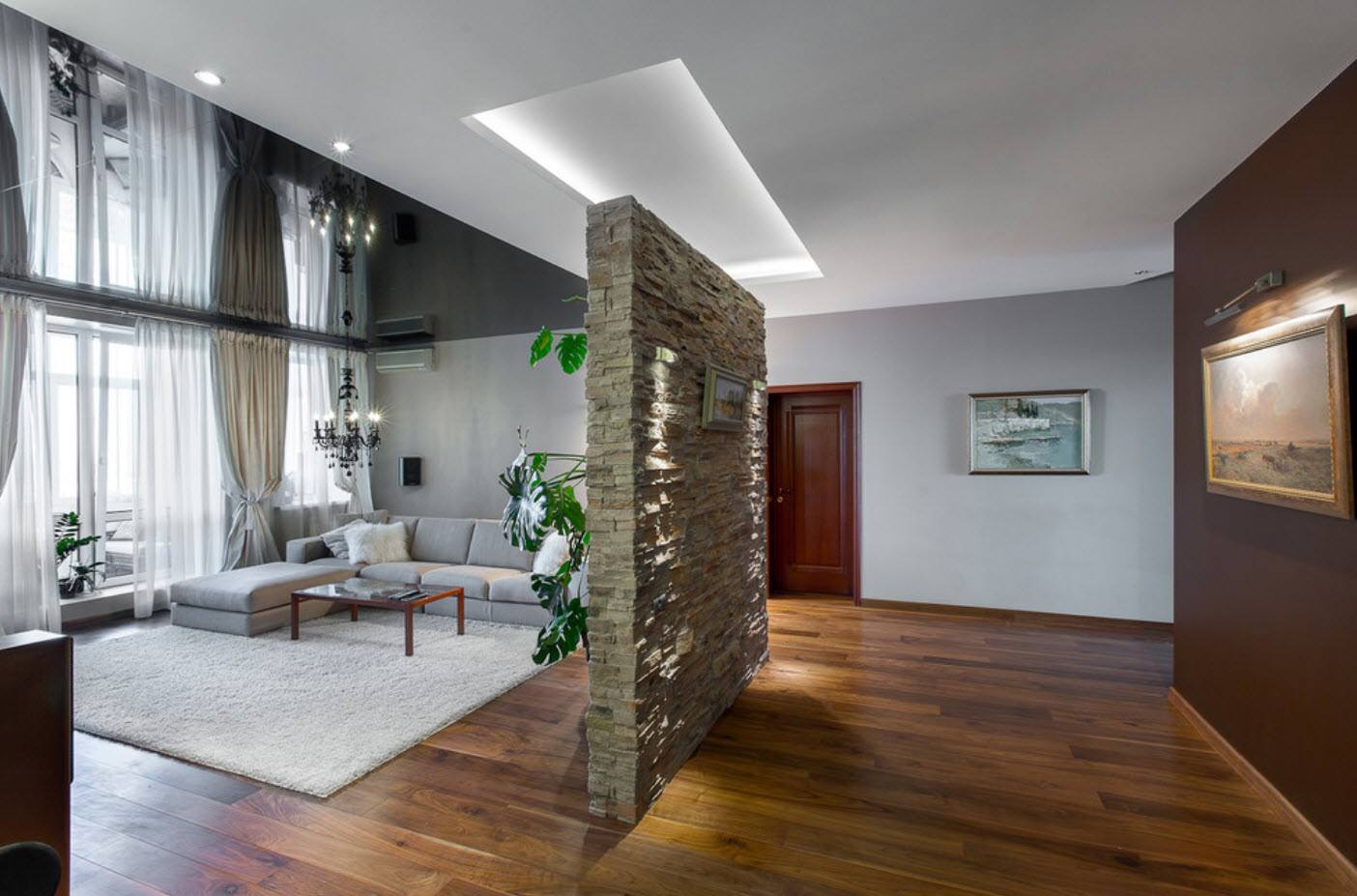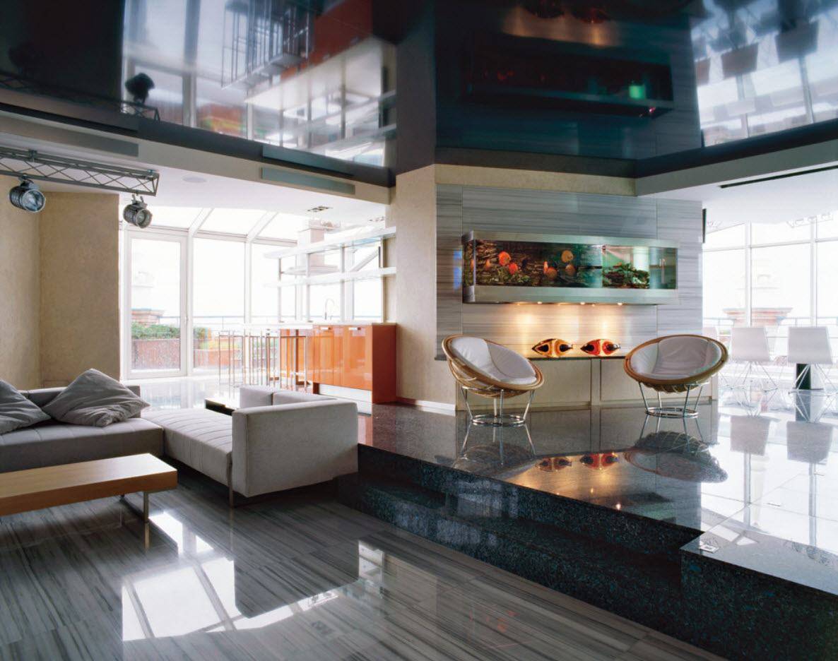 чрезвычайно эффектно смотрится комбинация матовых и глянцевых полотен. Разместив светоотражающий фрагмент в центре, можно зрительно изменить комнату. Зону в гостиной также выделяют глянцевым фрагментом.