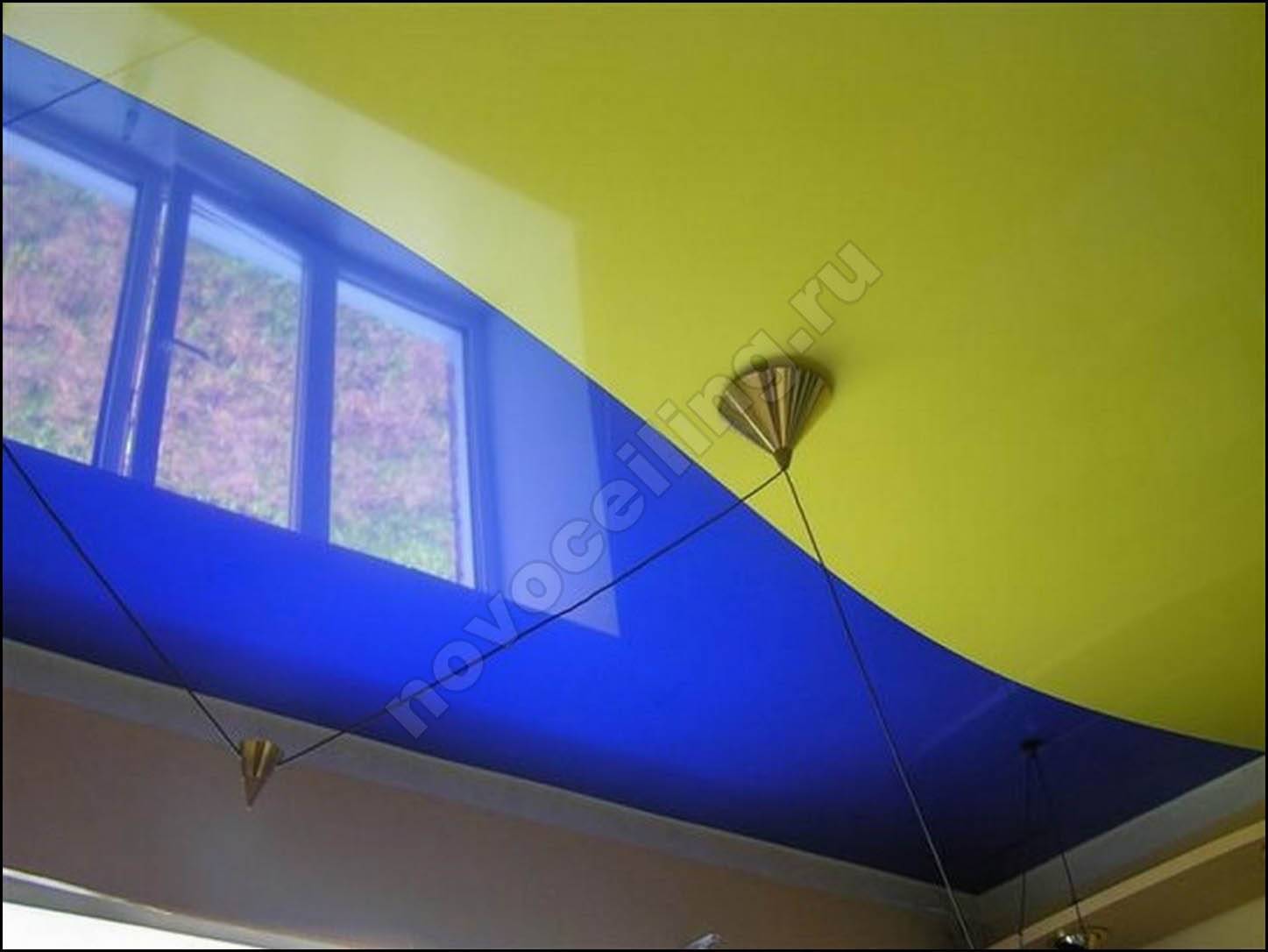 - Выбирая оттенки для натяжного двухцветного потолка, следует учитывать, что глянцевые полотна имеют больший цветовой спектр, чем матовые.