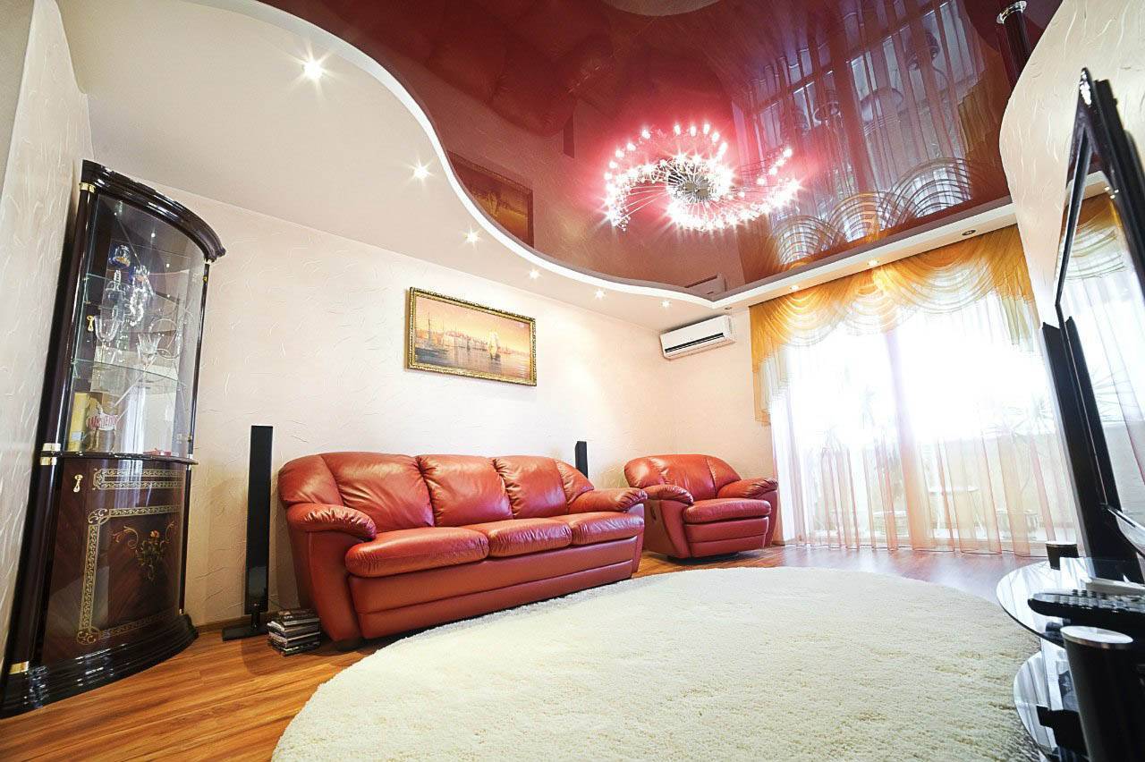 Красивый дизайн гостиной с красным натяжным потолком