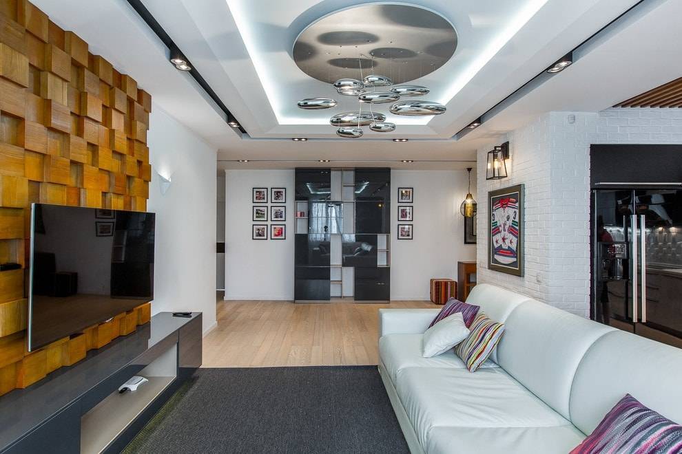 - маскировка дефектов: если потолок в гостиной покрыт неровностями и дефектами, такие конструкции позволят скрыть их от посторонних глаз;