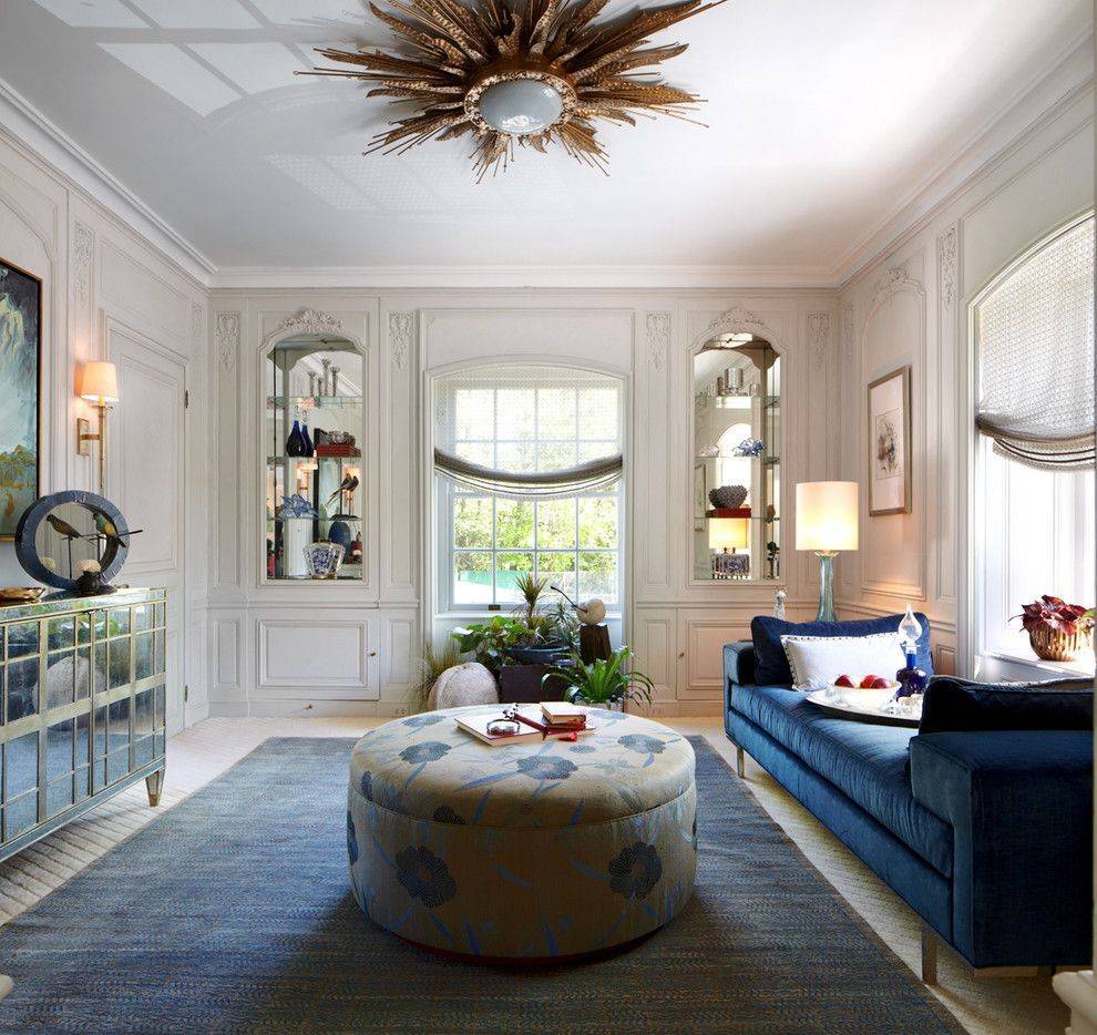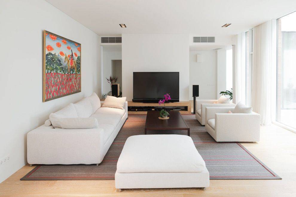 Такое смещение от центра позволяет зрительно изменять пропорции гостиной и акцентирует внимание на какой-то ее части
