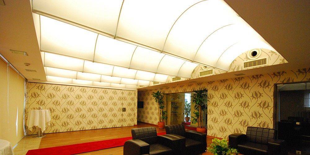 На фото – подвесные натяжные потолки в зале.