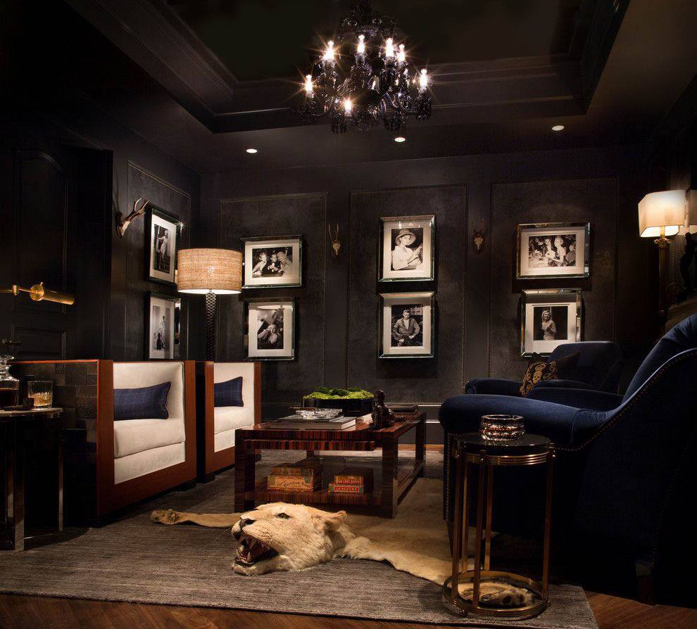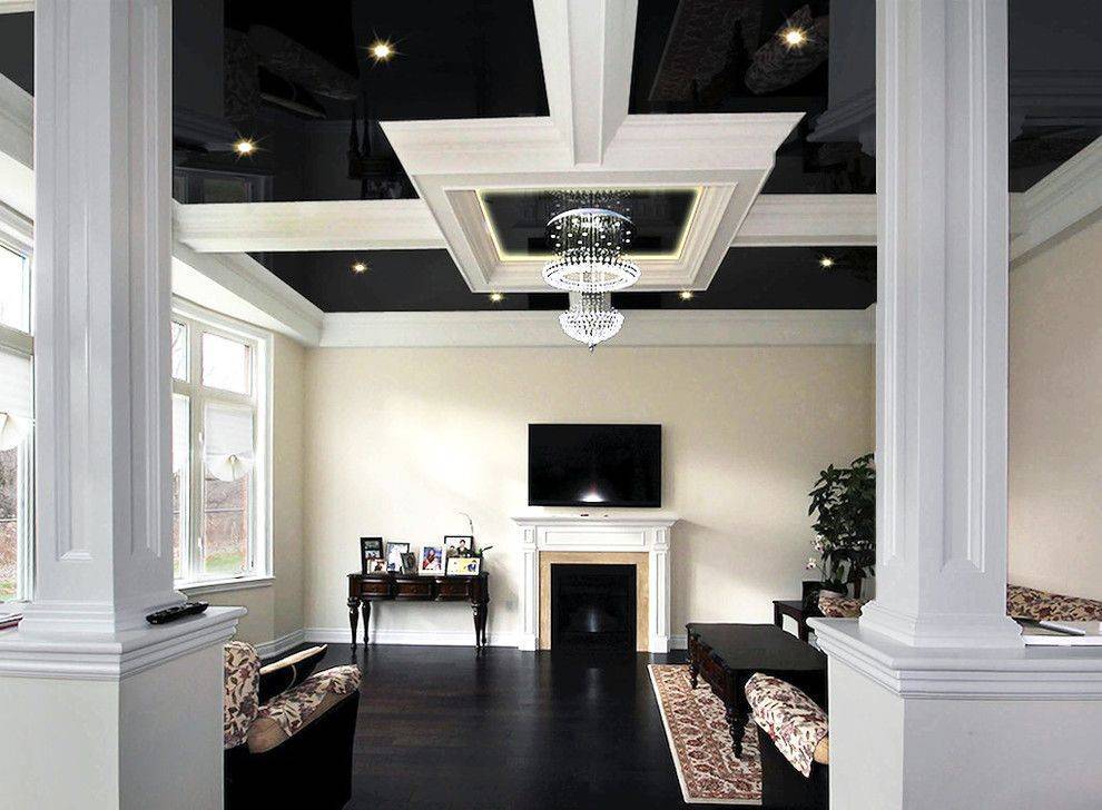Черный натяжной потолок может стать оригинальным решением для большой комнаты. Смотрится роскошно и глубоко, но для сохранения баланса света необходимо позаботиться о ярком освещении в комнате и отдать предпочтение глянцевой отделке.