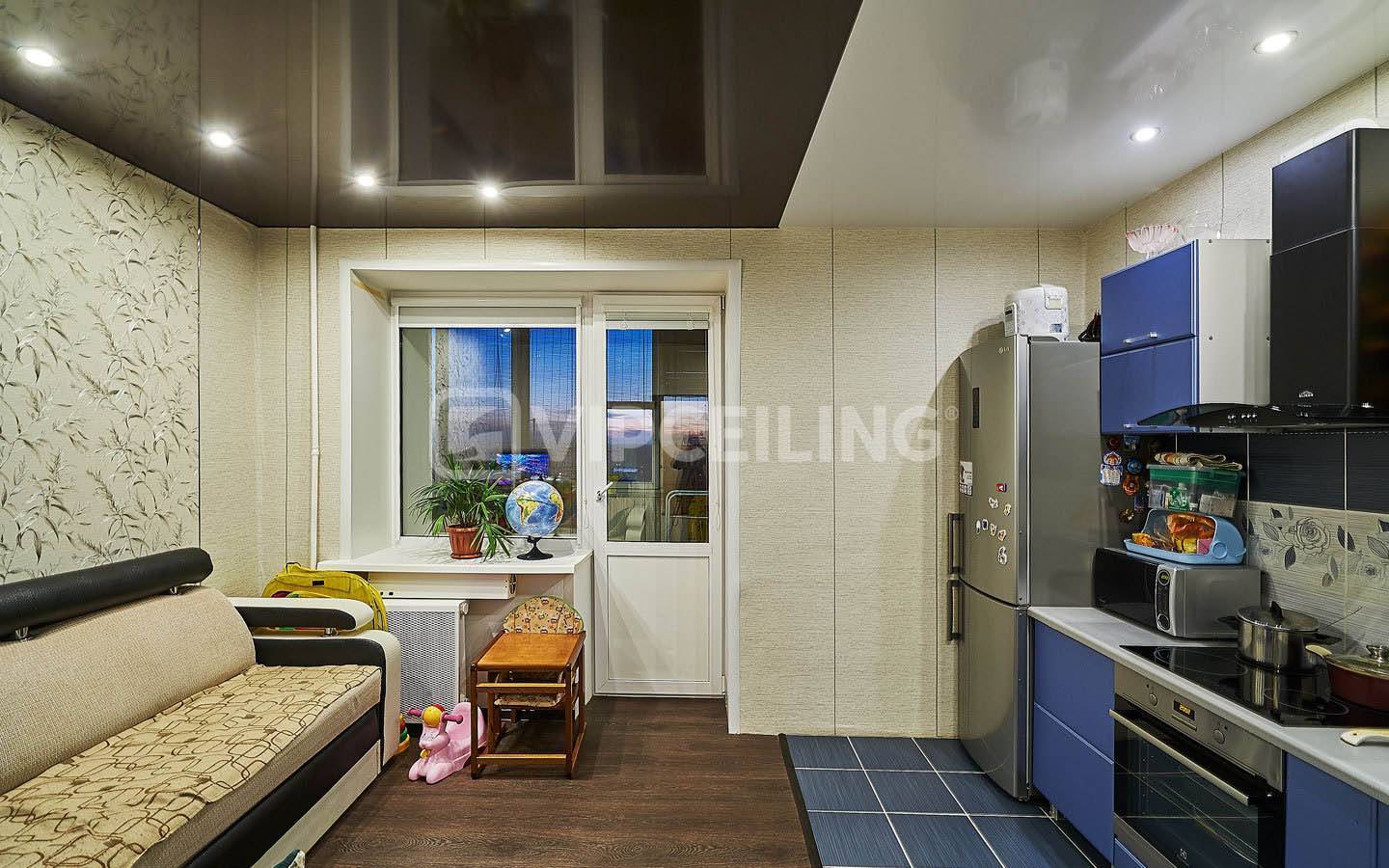 На кухне и вовсе двухцветные натяжные потолки могут выполнять не только декоративную, но и разделительную функцию, выгодно делая акцент на обеденной или рабочей зоне.