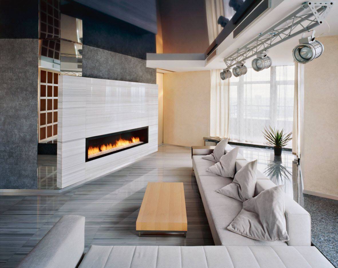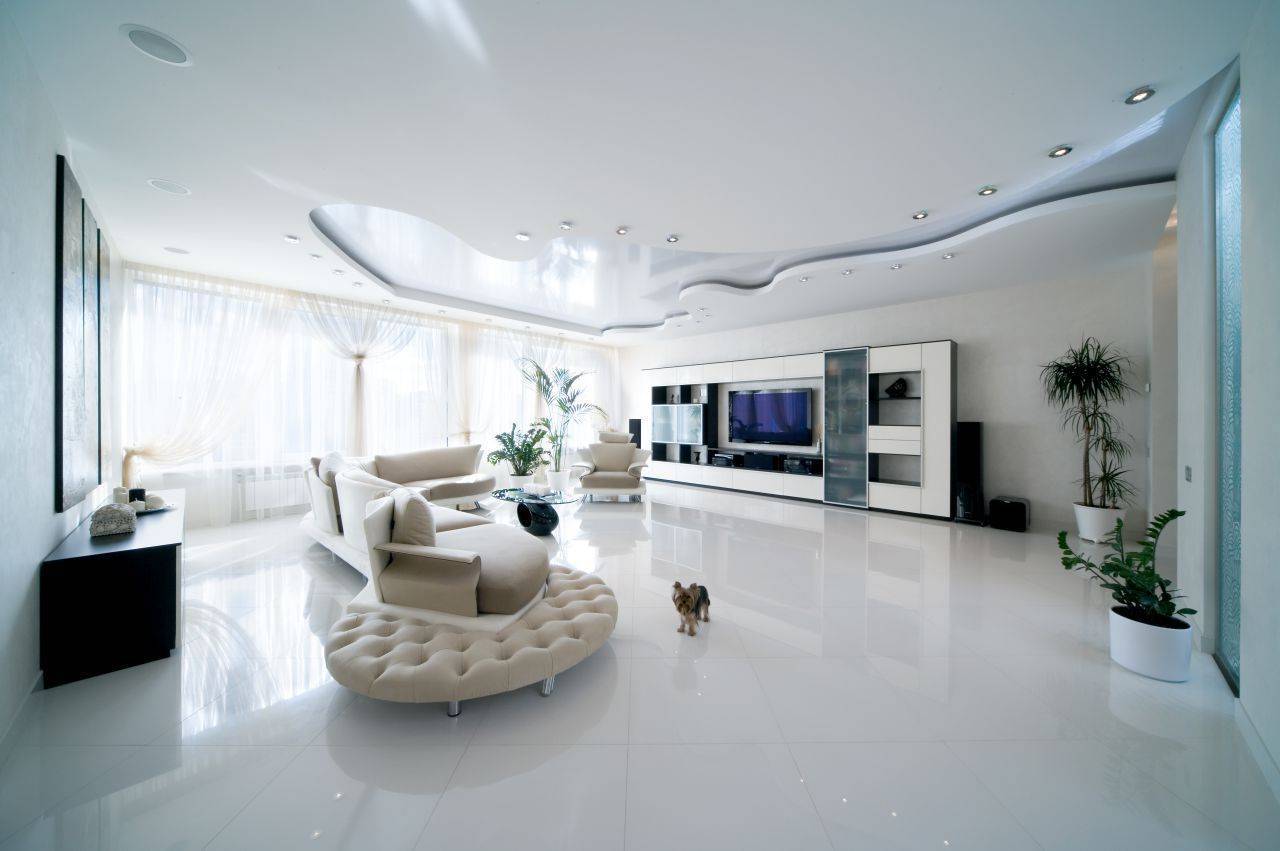 Классический белый потолок. Идеальным выбором для многих интерьеров зала является чисто белая расцветка. В этом случае вы получите эффективный блеск, который освещает интерьер. Такой потолок будет хорошо сочетаться со скандинавскими и минималистическими интерьерами.