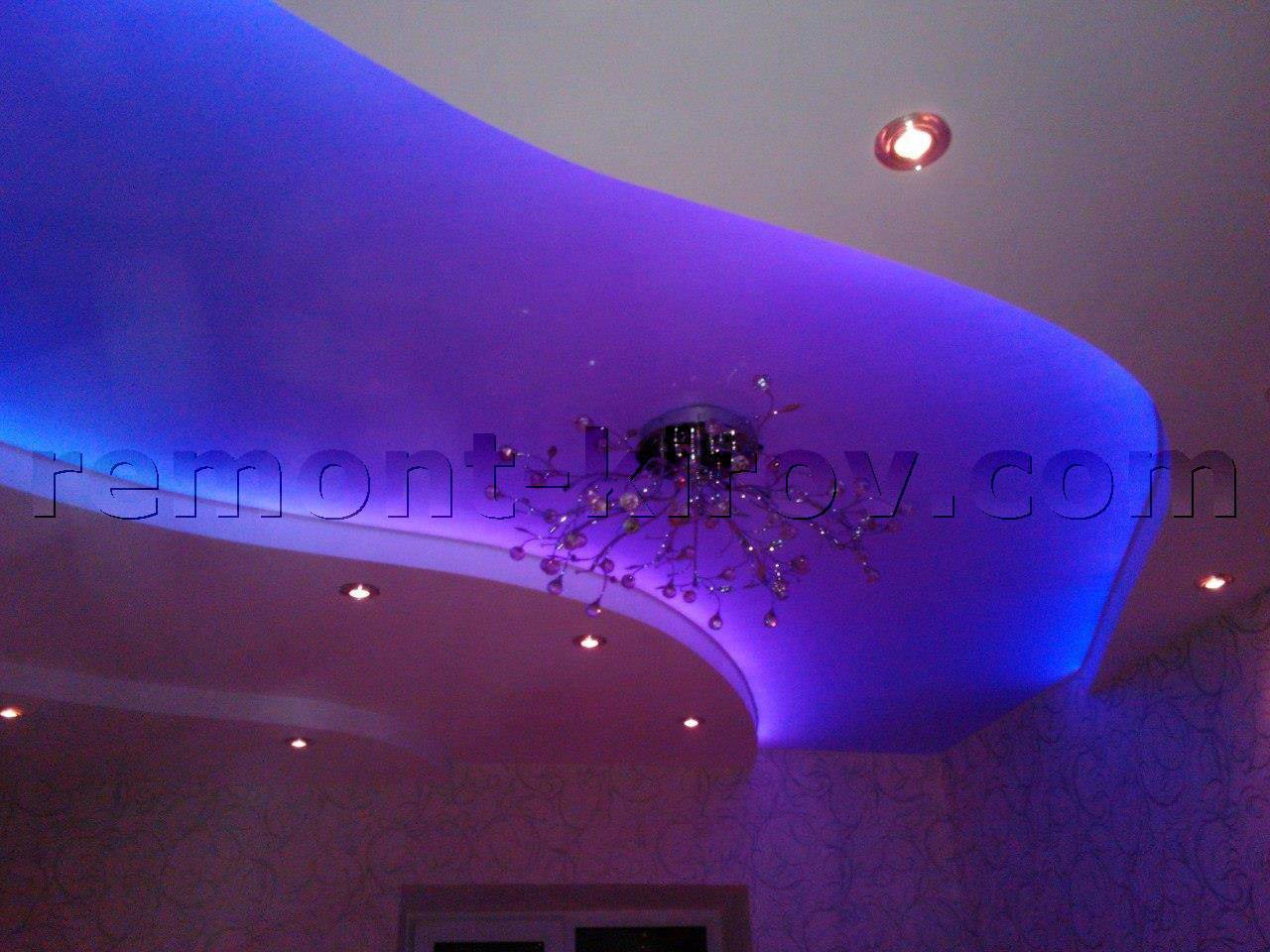 Световые решения с зеленой, оранжевой, желтой, белой или красной подсветкой, делают потолочную конструкцию более изысканной.