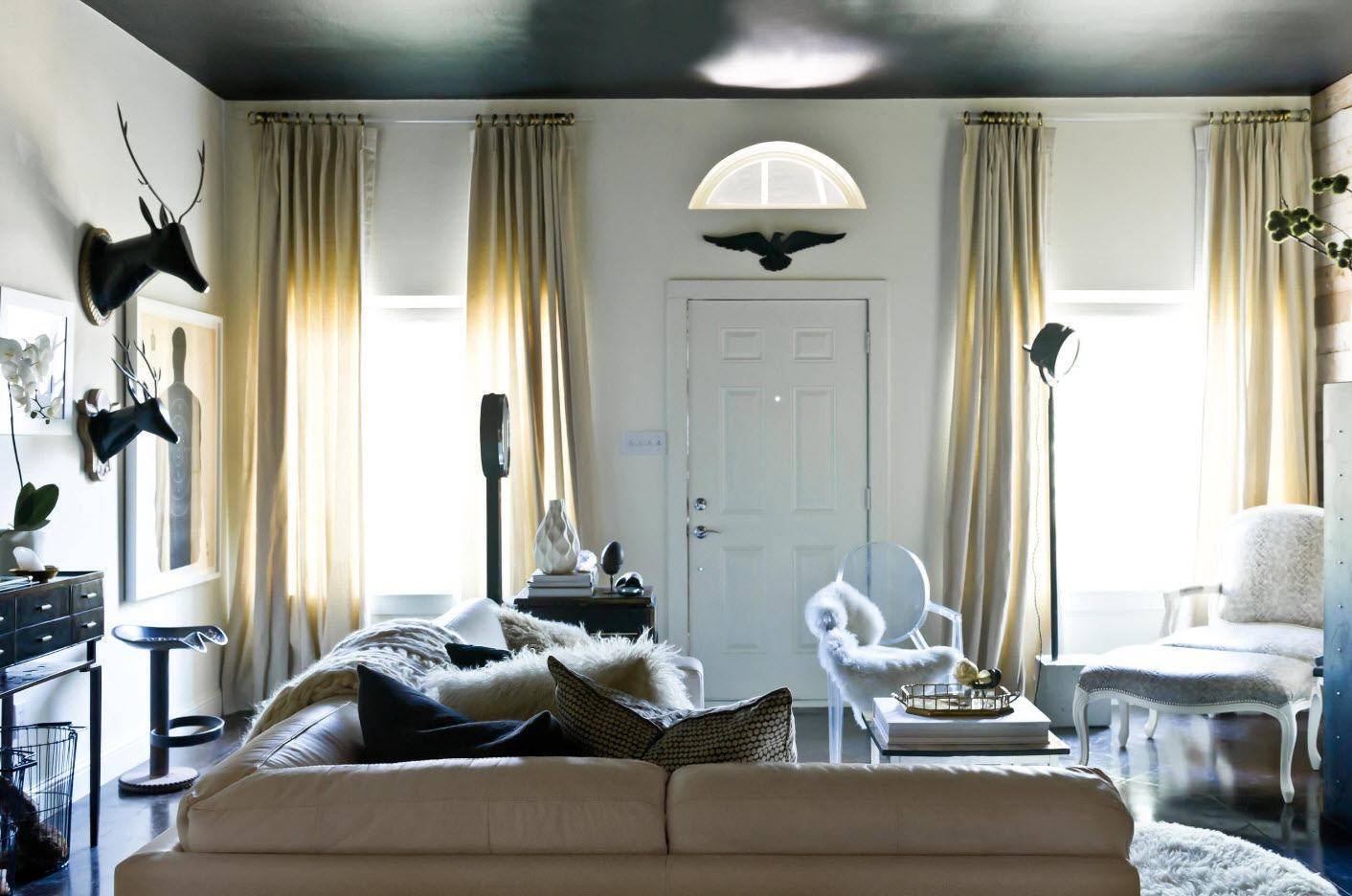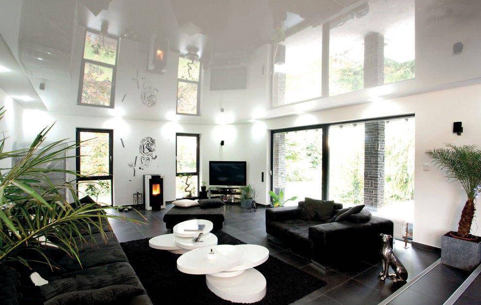 Черно-белый потолок. Вы получите оригинальный дизайн интерьера, выбрав овальную форму. Если выбрана черно-белая зеркальная пленка, то это сделает комнату высокой, несмотря на темный цвет. Эффект связан с тем, что огни освещения будут отражать предметы интерьера на потолке.