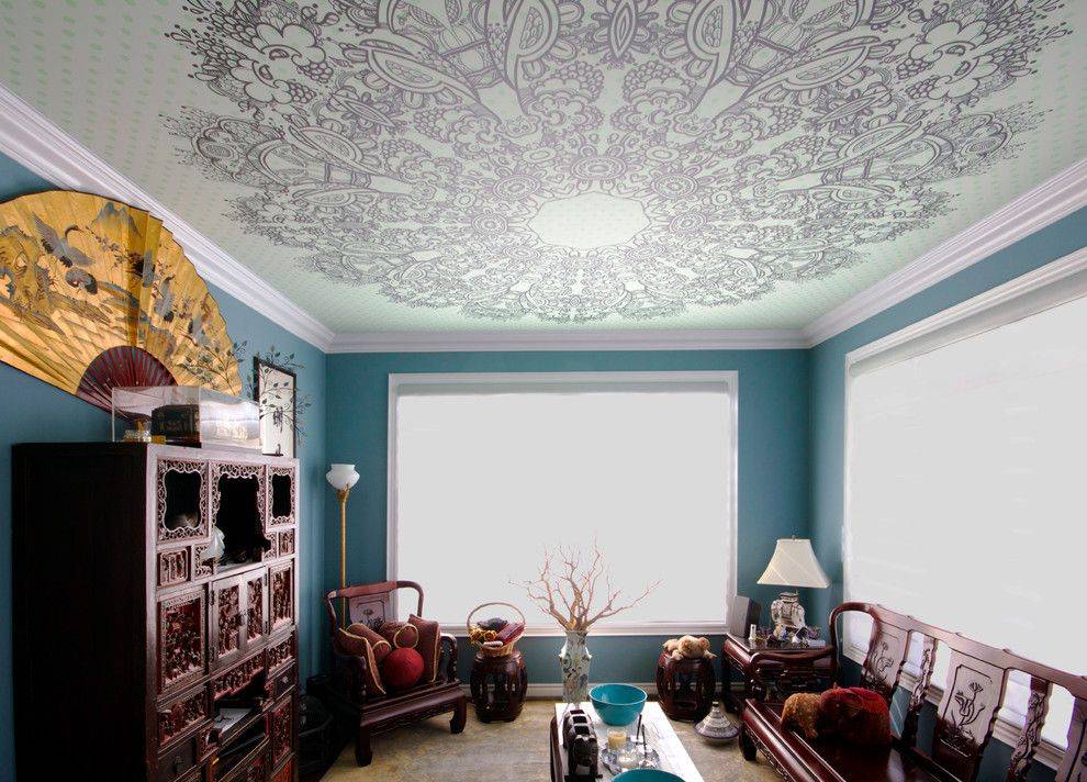 рисунок – точнее говоря, условное или абстрактное изображение, например, букет цветов, чашка кофе, затейливая красочная виньетка. Такой декор удобен тем, что позволяет зонировать комнату, так как собственно изображение занимает не весь потолок, а лишь какую-то его часть