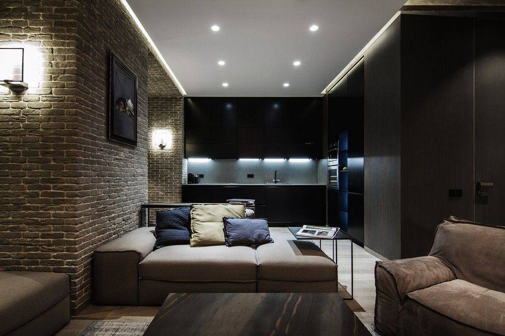 Вся проводка надёжно крепится на потолочной поверхности и прячется за покрытием. В зоне видимости остаются лишь красивые светильники и игра их теней. Нужно заранее продумать достаточное количество приборов на случай прихода гостей или создания романтического вечера, чтобы комната при этом не казалась мрачной и тёмной.