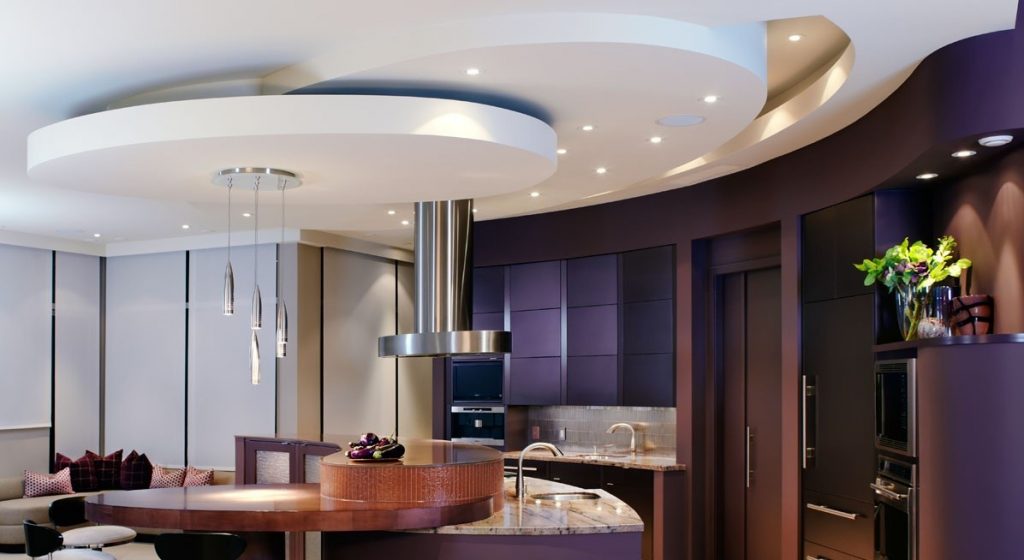 Хотите чего-то уникального? Подумайте о сложном многоуровневом потолке из гипсокартона, как на фото ниже – отличный вариант для оформления большой кухни.