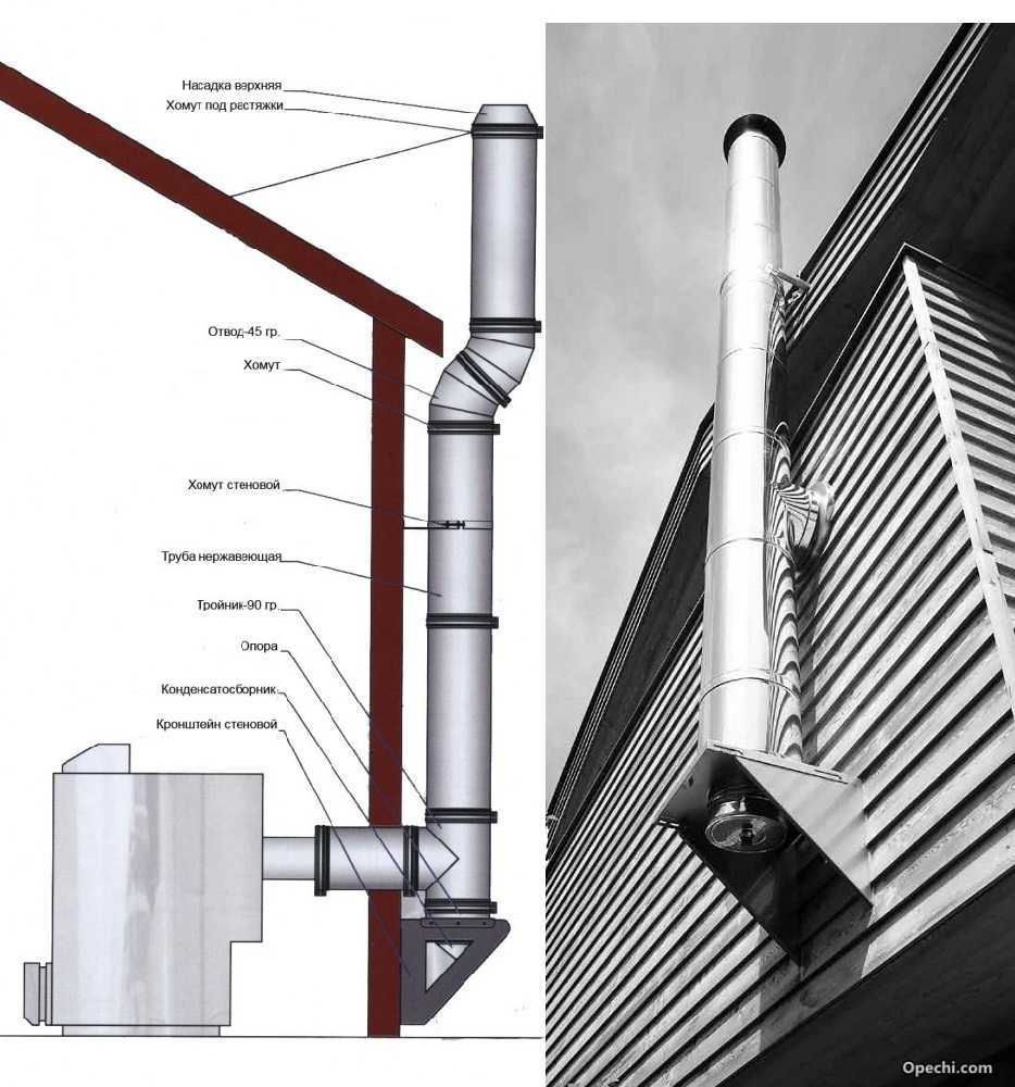 Чтобы в процессе работы устройства создавался необходимый уровень тяги, необходимо выбирать наружный вариант: тогда труба проводится горизонтально внутри дома, а с наружной стороны тянется вверх до выбранного уровня высоты. Также можно монтировать трубу сразу вверх: при этом она тянется через все перекрытия и поверхности. Выходит данной устройство над кровлей.