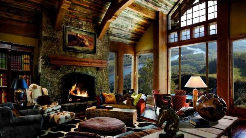 - Камин для гостиной кантри. Гостиные в загородных домах в стиле кантри не редко украшают каминами, ведь он отлично вписывается в просторное помещение с высокими потолками. Каминную зону оформляют деревом или камнем, выглядит все немного грубовато, но очень стильно. Над камином обычно вешают охотничьи трофеи, оружие.
