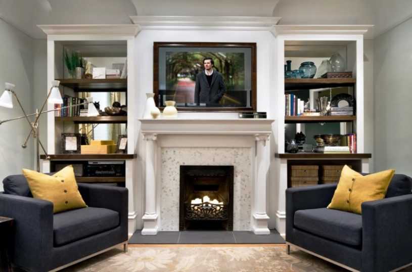 В гостиной довольно сложно совместить телевизор и камин, особенно при небольших размерах помещения. Оба предмета служат центром внимания, поэтому могут «конкурировать» друг с другом. Чтобы проблем не возникало, можно использовать следующие приемы: