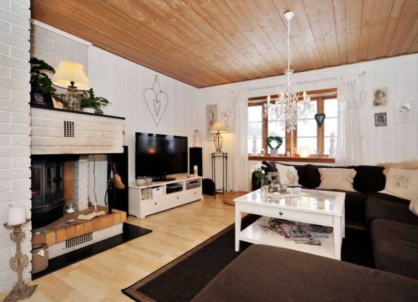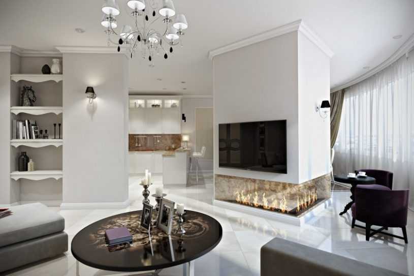 При этом каминную зону отдыха следует располагать у окна. Встроенный камин в гостиной вполне компактный и идеально разделяет пространство помещения. Доминирующим цветом в таком помещении можно выбрать один из оттенков молочного цвета.