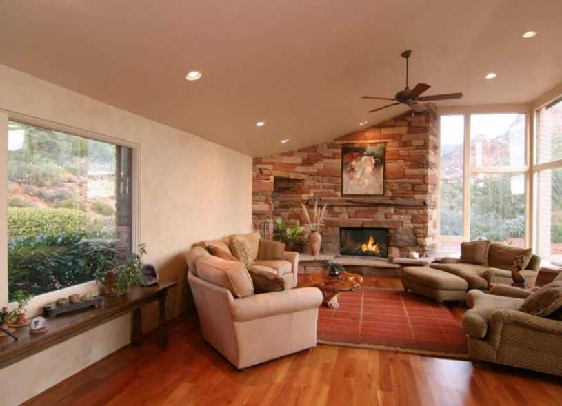 Для небольшого помещения уместно будет угловое расположение камина. Оформление портала с оригинальными элементами декора будут хорошо сочетаться при любом стиле. Так же следует избегать расположения открытого очага в районе лестницы.