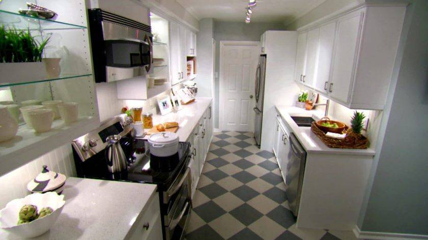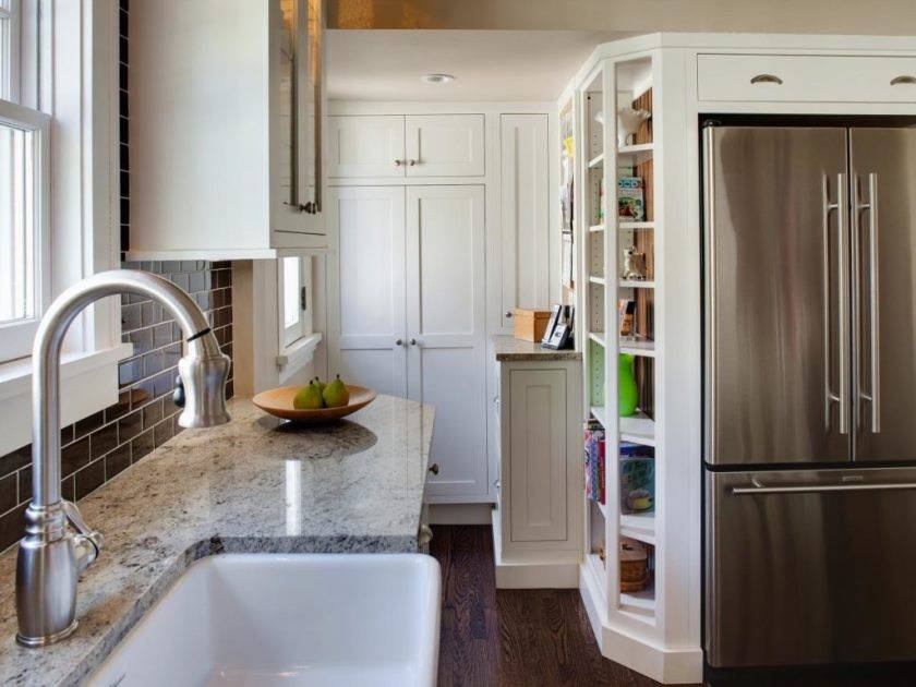 Это самый распространенный вид планировки кухни. В этом случае желательно оптимально использовать внутренний прямой угол. Специалисты советует размещать в этой части комнаты рабочую поверхность и кухонный гарнитур для маленькой кухни. Если столешница гарнитура или же стола расположена около двери, то можно слегка закруглить ее угол. Так помещение немного увеличивается, а вход в комнату становится гораздо безопасней. Это особенно актуально при наличии маленьких детей.