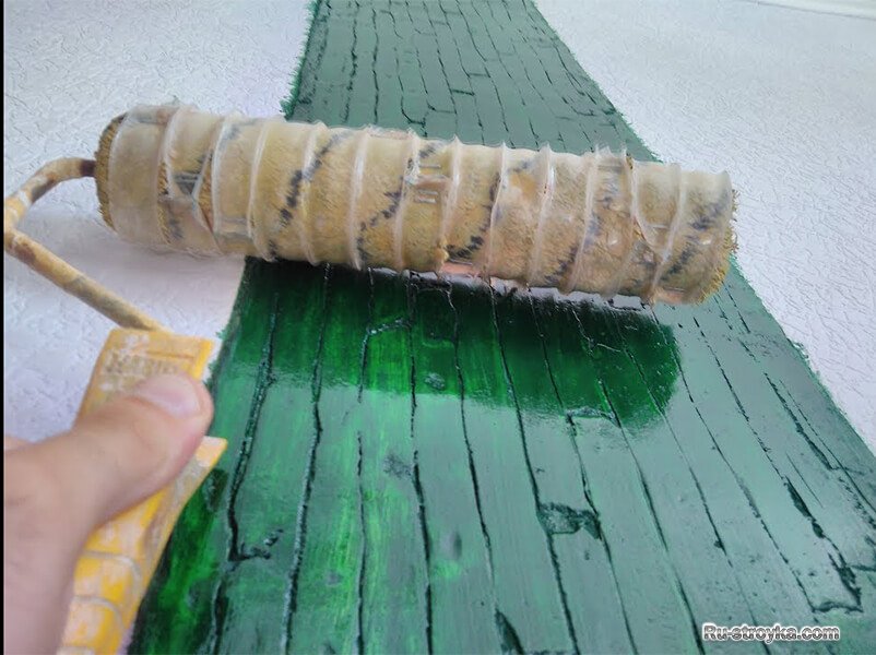 Рекомендуется после первого этапа выдерживать 10 минут. На следующем этапе работу следует осуществлять сверху вниз. Если изменять степень нажатия на валик, возможно достичь разных эффектов. Подобный прием можно использовать, чтобы подчеркивать отдельные декоративные элементы.
