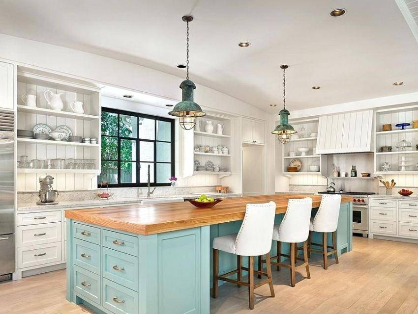 - оформление в светлых тонах. Отличительной чертой стиля считается применение светлых оттенков как для отделки, так и для изготовления кухонных фасадов и элементов мебели. Некоторые предметы специально состаривают, чтобы создать эффект потертости и выгоревшей на солнце поверхности;